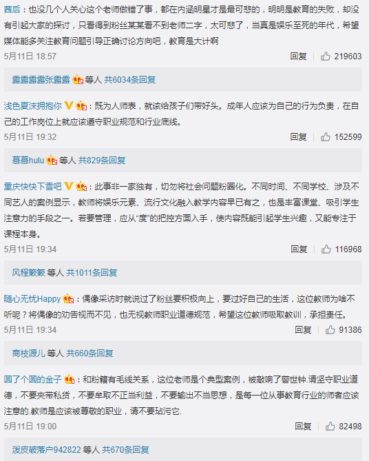 要知道,现在你教育的人是我们祖国的下一代啊,他们现在正处在不能分辨是非、容易被带偏的一个年纪,而家长把孩子送到学校,是想让孩子学得知识,学会认知,学会分辨是非,而不是想要自己的孩子被传输这些追星的事。我们不反对老师追星,但是反对作为老师,把自己的这种追星“情怀”施加给下一代。现在的老师,很多老师都已经是90后了,而90后后,是追星女孩疯狂的一代。但是,希望在孩子们面前收敛一点,为人师表。不然迟早你们的偶像迟早被你们自己弄糊。