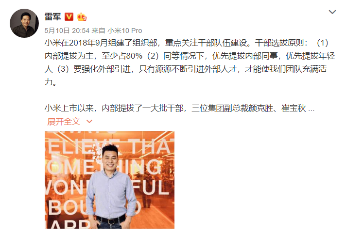 5、雷军公开小米干部选拔原则:内部提拔为主,至少占80%