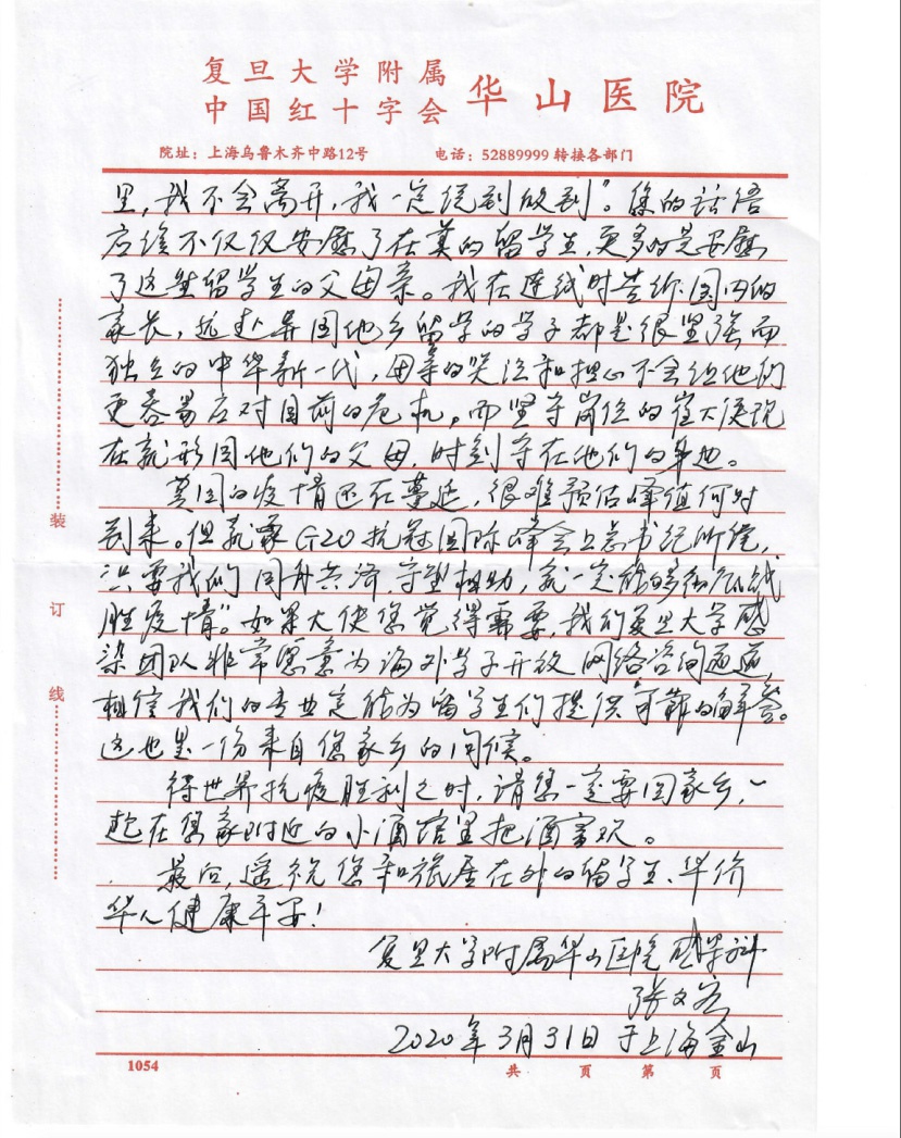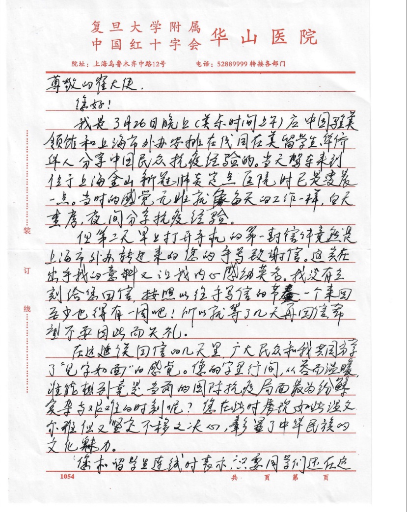 3月底,中国驻美大使崔天凯手写致信张文宏教授,感谢他在网络上向海外华人科普抗疫知识。地球这一头,在崔大使心心念念的上海,张文宏用华山医院的信纸,同样以手写的方式给大使回了一封信。