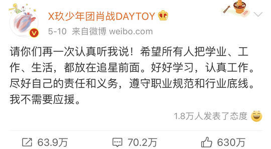 昨晚深夜,肖战发博回应了这件事,表示“所有人把学业、工作、生活,都放在追星前面。好好学习,认真工作。尽好自己的责任和义务,遵守职业规范和行业底线。我不需要应援。”