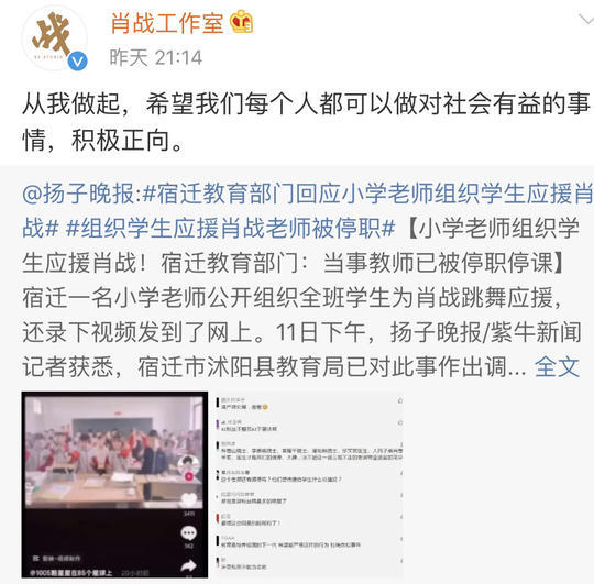 5月11日下午,据扬子晚报报道,短短一天时间内,宿迁市教育局已经接到了多方投诉,经核实,相关视频中有一位确认是宿迁市沭阳县的,网传她带领全班小学生给肖战应援的情况属实。