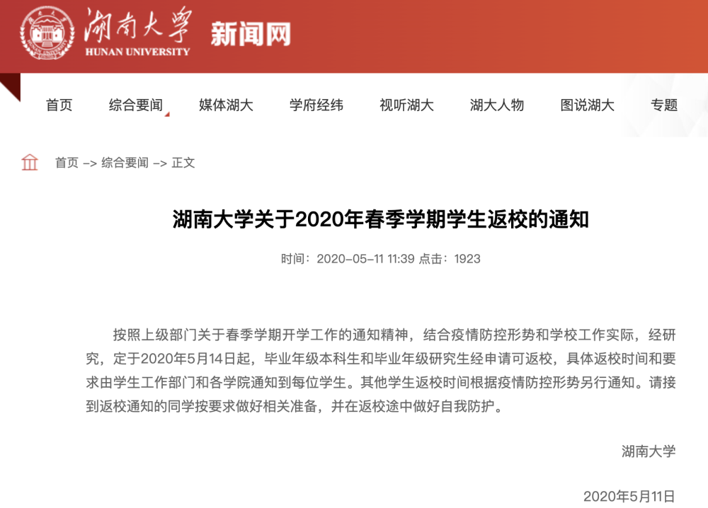 近日,湖南大学开学时间定了!湖南大学官网发布湖南大学关于2020年春季学期学生返校的通知,明确指出2020年5月14日起,毕业年级本科生和毕业年级研究生经申请可返校。