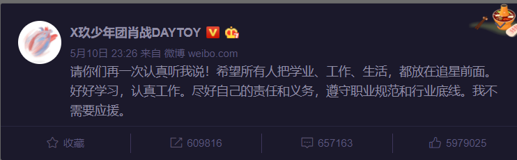 文末他甚至还表示:“我不需要应援”,当然肖战指的是不需要那些不理智的应援。