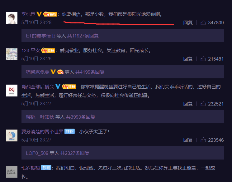 在昨天肖战很愤怒的发声之后,评论里有位粉丝的留言就很显眼。这位粉丝表示:“你要相信,那是少数,我们都是很阳光地爱你啊。”