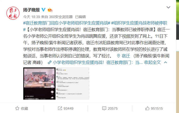 另外,关于对那名带着学生给肖战应援的教师处理结果也出炉了,已经被停职停课。当事教师也认识到了自己的错误,写了检讨。