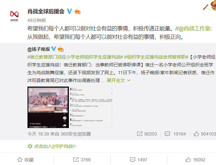 从这条动态中可以感觉出肖战挺生气的,之所以发声,是因为有个别粉丝的行为又惹出了争议,该粉丝是一名小学教师,为了给肖战应援,竟然拉着全班的学生一起喊口号,还上传了视频。
