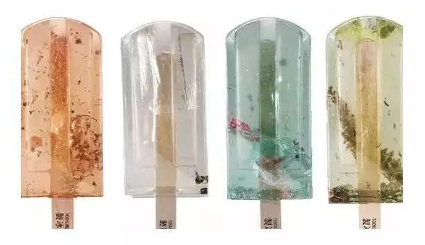 制作的。看上去晶莹剔透的“冰棍”,里面却是可怖的垃圾,塑料包装、烟灰等清晰可见!