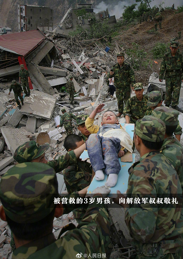 在这次大地震中也有很多的像:教师谭千秋用生命完成了最后的使命一 为了四个学生,他张开了双臂;妈妈用自己的身体为孩子撑起生命的天空;消防队员的战士“求求你们让我再去救一个!我还能再救一个!”他们一样的实例在告诉我们生命的可贵、生命的顽强、国人有多团结。