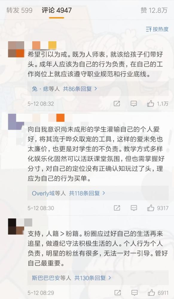 如今,每个偶像的粉丝团体有老师、学生、工人、普通上班族等等。我认为肖战有句话说得很对,"尽好自己的责任和义务,遵守职业规范和行业底线,把一切生活和工作放在追星之前"。就此次事件来说,粉丝是一名老师,教师所担负的责任是教书育人。作为个人,她可以理智追星,为自己喜欢的偶像应援,我们不能干涉她的私人生活。但作为教师这个身份,她最大的不该就是触及行业底线。学校是传播知识、弘扬美德的神圣地方,每一个学生都会是祖国的未来。从行业的角度来看,她显然违背了自己的职业道德。