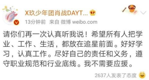 5月10日晚,肖战发布微博,言语严肃:请你们再一次认真听我说,希望所有人把学业、工作、生活都放在追星之前,好好学习、认真工作。尽好自己的责任和义务,遵守职业规范和行业底线。最后还强调说:我不需要应援!这次肖战的态度已经非常明确了,就是希望粉丝们可以认真的过好自己的生活。