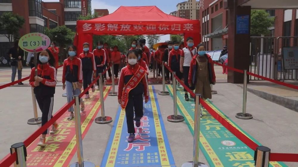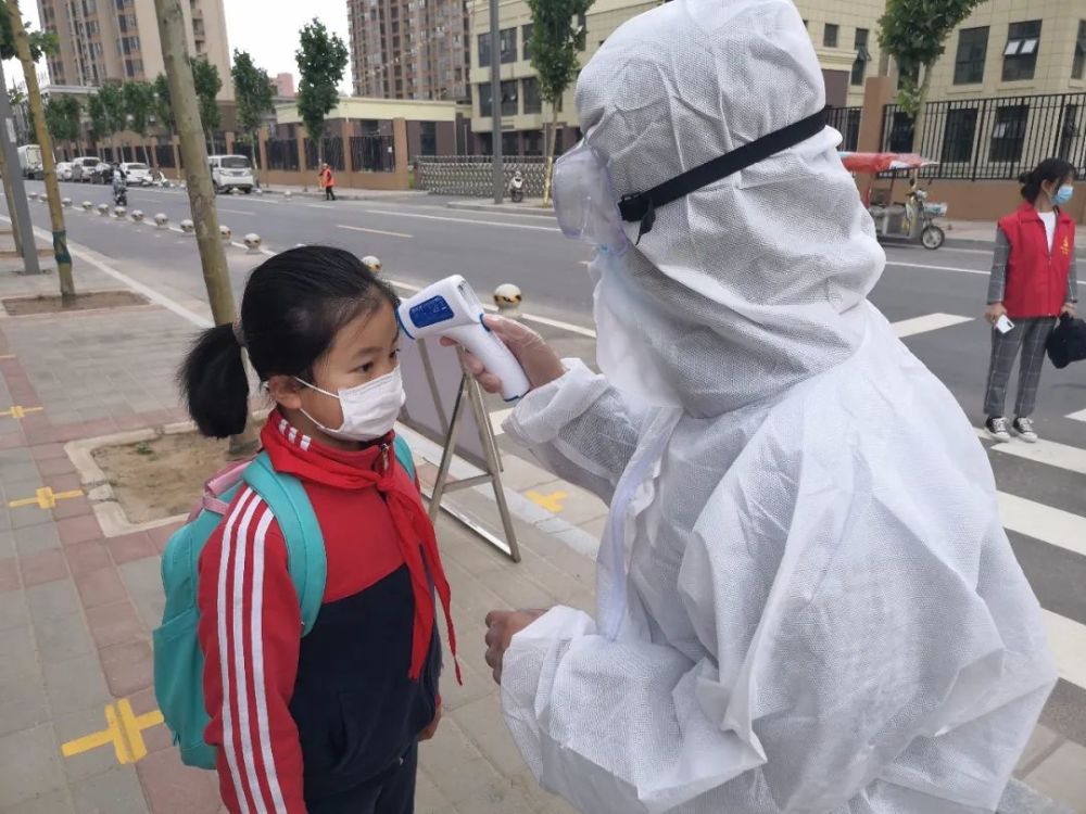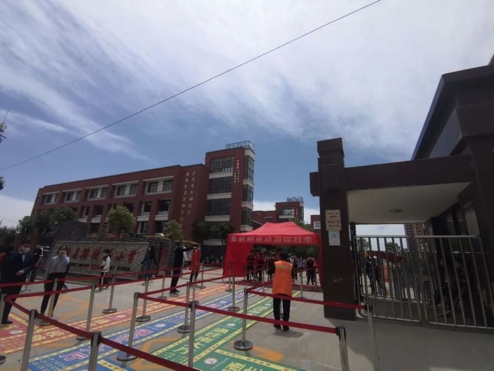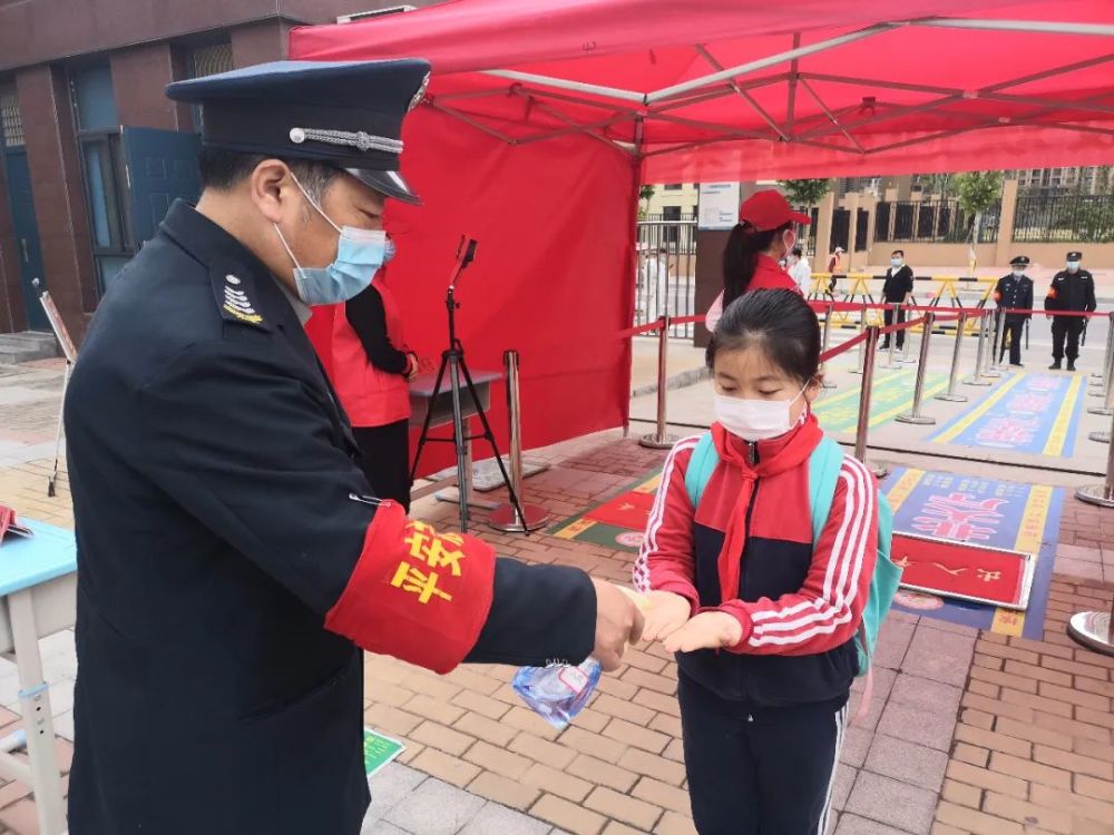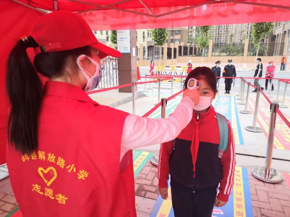 为了确保孩子们快速、平稳、有序的进入校园,中牟县解放路小学实行了错时间段,错年级入校,学校在校门口两侧设置了三个入学通道,每个通道至少有5名老师职守,设有体温检测处、物品消杀处。