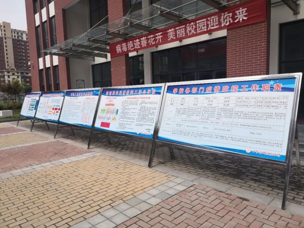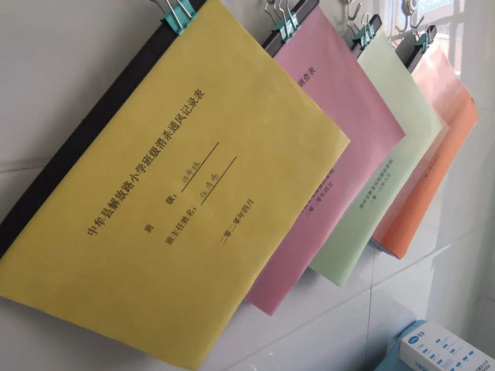 在疫情防控方面,中牟县解放路小学也是做足了充分的准备,小到走廊随处可见的废弃口罩回收箱、墙上贴的相关警示标语,每班班级门口配备的体温计、消毒液以及消杀通风等相关记录表,大到学校制定的疫情防控专栏,以及每天召开的工作会议。