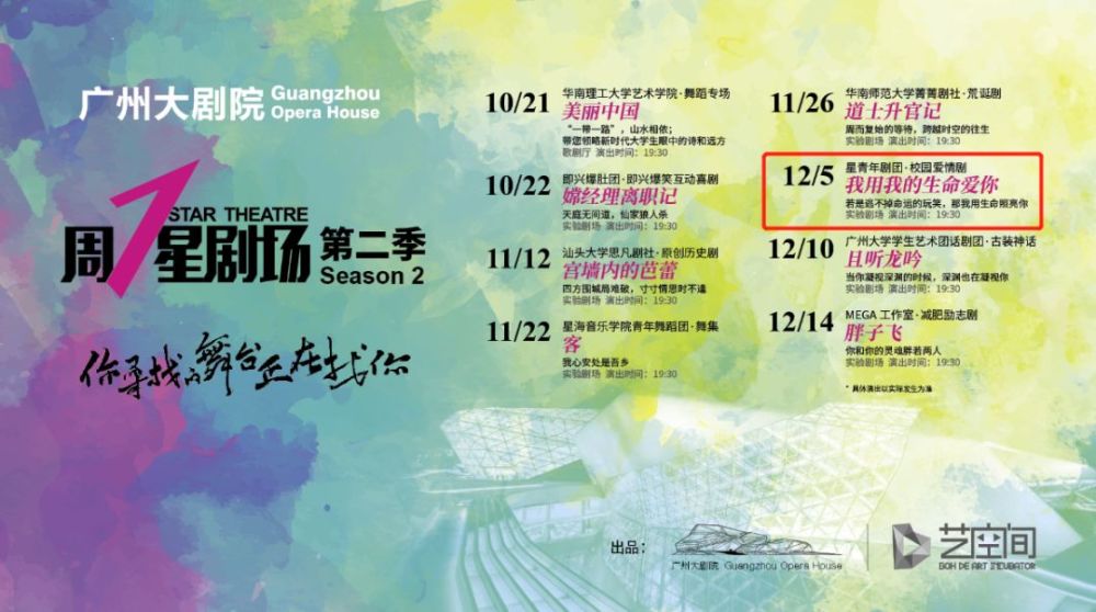 12月5日19:30分,广州大剧院周一星剧场第二季《我用我的生命爱你》,一场关于青春悸动的故事将由星青年剧团开启,年少的纯真记忆即将被唤醒。