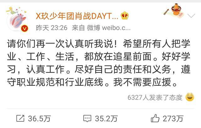 肖战也是连夜发文说我不需要应援。肖战说,希望所有的人把学习工作生活放在追星的前面,好好学习,认真工作,尽自己的职责和义务,遵守职业规范和行业的底线