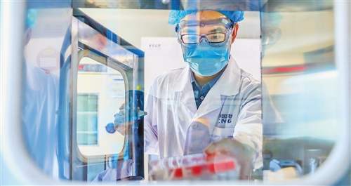 工作人员在国药集团中国生物新冠疫苗生产基地质量检定部门从传递窗拿取新型冠状病毒灭活疫苗样品。 新华社记者 张玉薇摄