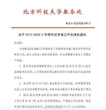 北京科技大学结合当前特殊情况,在期末考试和补考方面也做出了适当的调整。其中如果在考试周之前学生尚未返校,那么所有课程的期末考核将通过线上考核的方式进行,此外,对于2014至2016级需要参加第一学期补考的学子而言,他们的补考将于5月25日至5月31日在线上进行,至于其他年级的补考则返校后再进行。