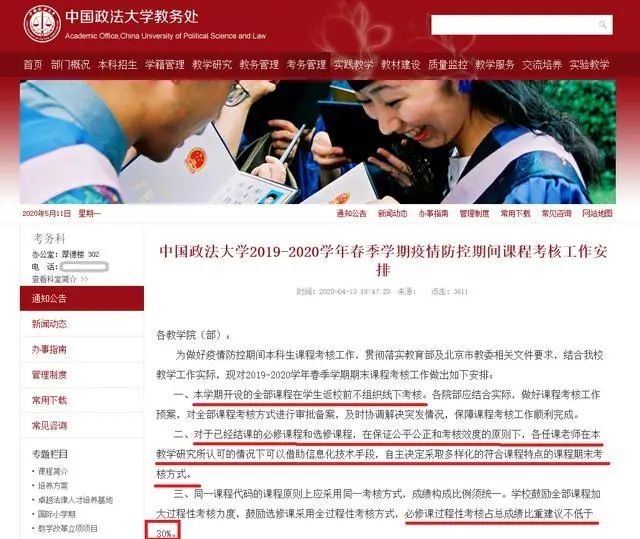 中国政法大学在期末考核安排上也做出了适当的调整,其中明确在学生返校前不会组织线下考核。所以大家也不用担心为了期末考试专门往学校跑一趟的情况发生。同时,对于已经结课的必修和选修课程,建议任课教师在确保公平的情况下借助现代化信息技术手段自主决定考核方式,换句话说,就是会通过线上考核的方式对大家进行期末考核。同时值得注意的是,该校建议加大过程性考核力度,降低期末考核成绩占比,所以,同学们一定要注意平时表现,不论是课堂上的互动还是平时作业的完成情况都将成为至关重要的一部分。