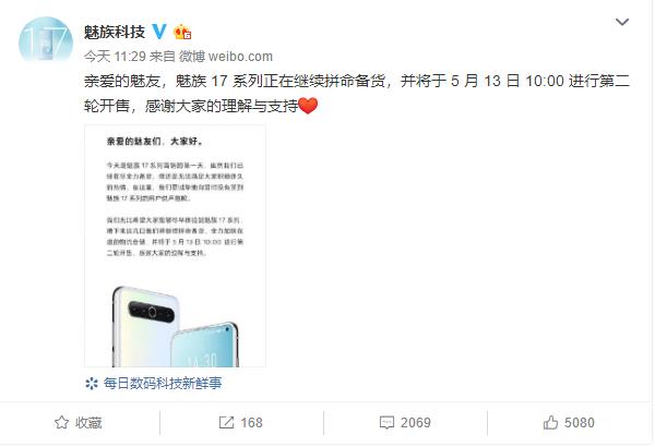 原标题:魅族 17疯狂备货中 5月13日开启第二轮销售