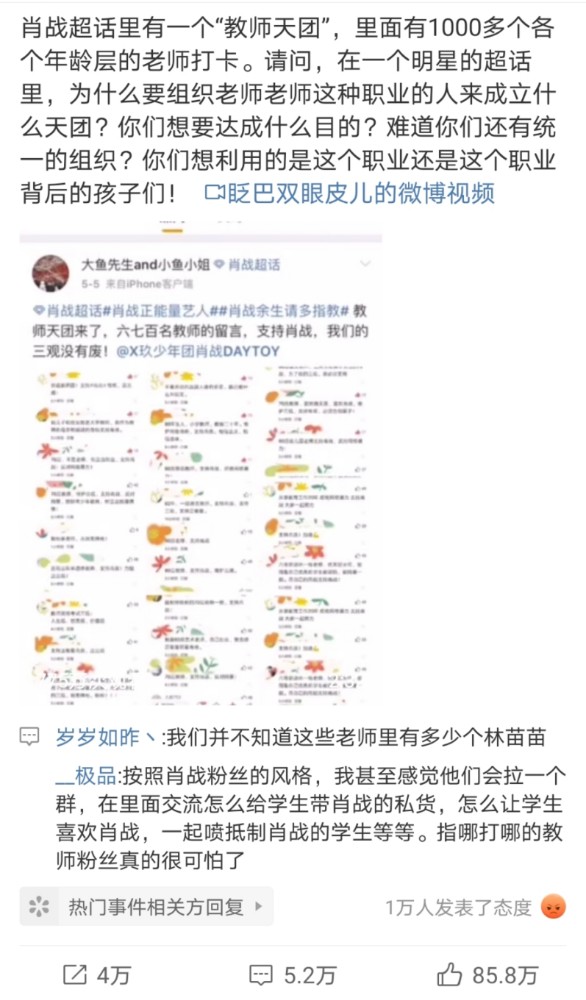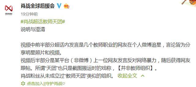 肖战的粉丝后援会也在澄清视频前半部分只是几名教师自己个人在微博追星,并没有成立所谓的教师组织,更不存在“教师天团”之说,视频也是经过拼凑和剪辑的。