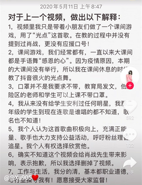 那么问题来了,这张截图又是怎么回事呢?截图中的内容提到了《光点》这首歌,这其实最大的漏洞。通过网上的消息来看,小学生应援肖战的视频拍摄时间应该是2019年的9月份,那个时候还没有《光点》这首歌。加上目前处于特殊时期,小学生并没有完全复课,这位老师是怎么在课间时间组织学生用《光点》来跳手语舞的呢?