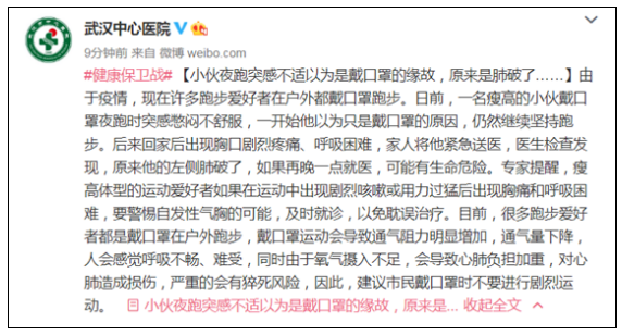 5月11日,武汉市中心医院在官方微博发布了这样一个病例,并提醒瘦高体型的运动爱好者如果在运动中出现剧烈咳嗽或用力过猛后出现胸痛和呼吸困难,要警惕自发性气胸的可能,及时就诊,以免耽误治疗。