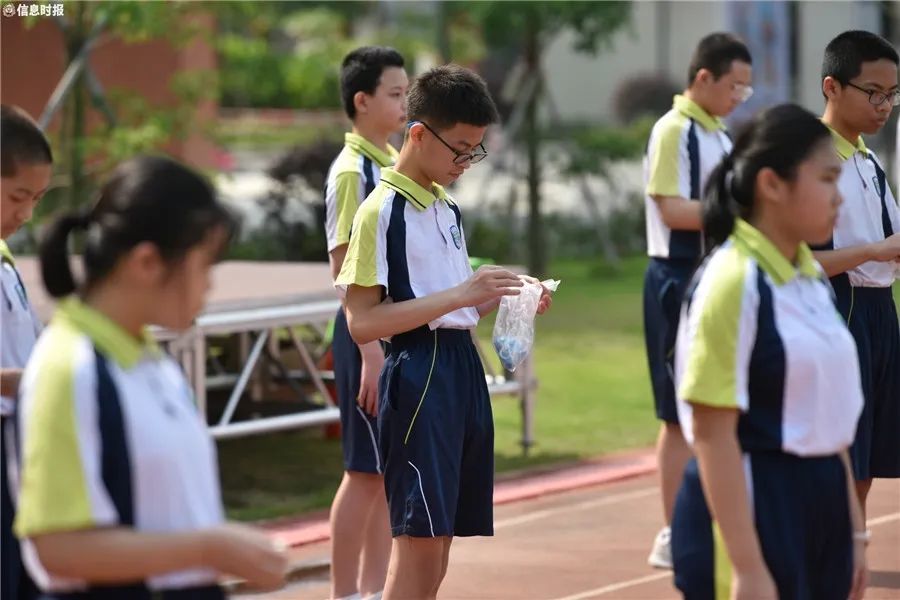 5月11日,广州学生在运动前,先摘了口罩,放在袋子里。