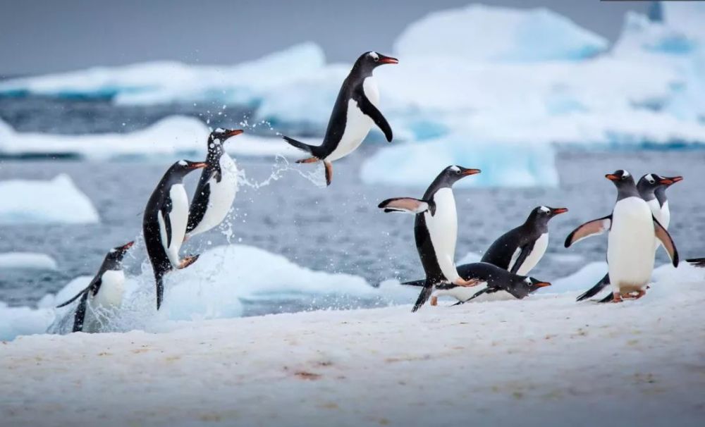 一群巴布亚企鹅从水中飞到一块浮冰上