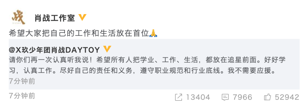 肖战本人及其工作室也是很快做出回应:“请你们再一次认真听我说!希望所有人把学业、工作、生活,都放在追星前面。好好学习,认真工作。尽好自己的责任和义务,遵守职业规范和行业底线。我不需要应援。”