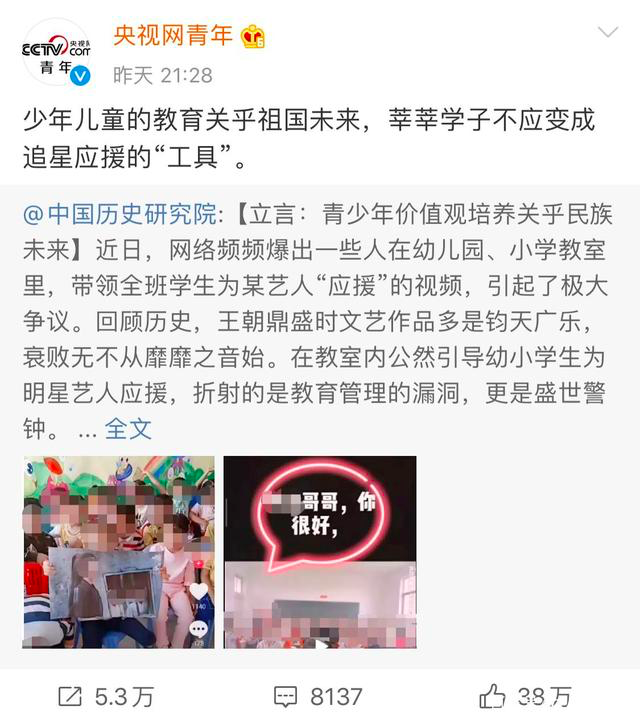 近日,网上出现了一段教师引导全班学生帮助肖战应援的视频,引发网友热议。随后,众多官媒纷纷转发,指责这种不良的追星风气。一时之间,恶俗的“饭圈文化”又被推上风口浪尖。尤其是对于刚刚开始复出的肖战来说,就更是致命的一击。