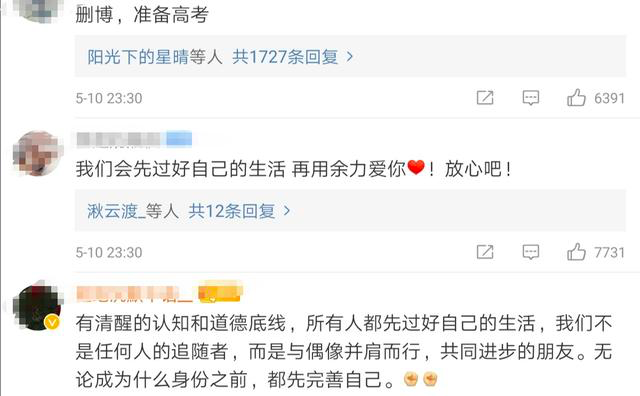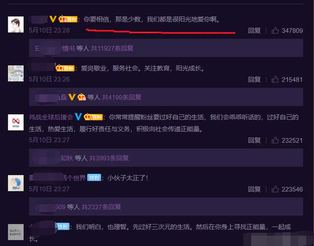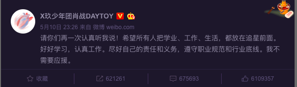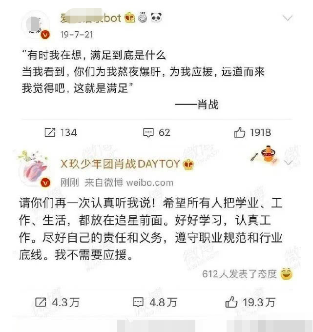 5月10日深夜,肖战发布微博呼吁粉丝理智追星,勿要影响个人的学习和生活,最后语气严肃地加上了一句:“我不需要应援”。肖战表态后,小飞侠们迅速接力,一边与不理智的粉丝划清界限,一边积极响应肖战的正面追星态度。