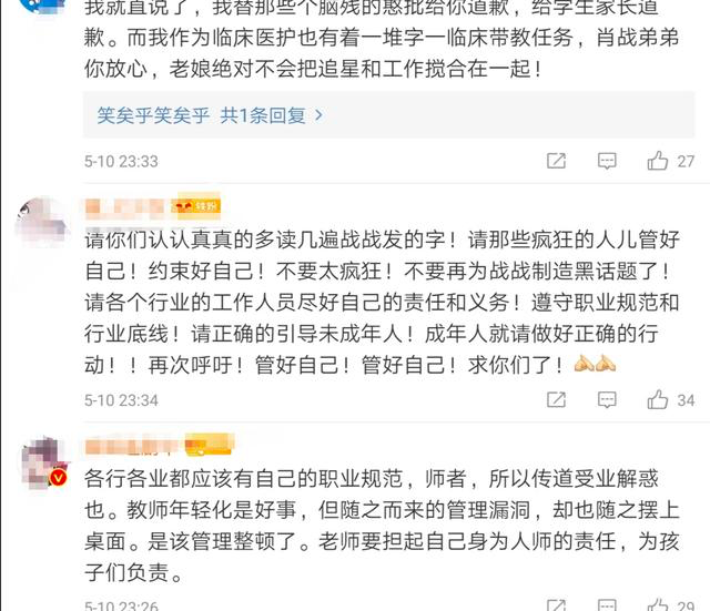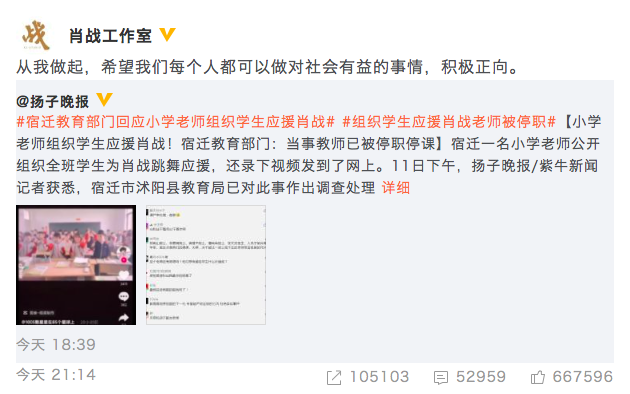 5月11日,肖战工作室转发了涉事老师被处罚的相关报道再发文呼吁:“希望每个人做对社会有益的事。”随后,小飞侠们也纷纷表态支持这一处理结果,高声响应肖战和工作室的号召,在评论区留下了众多积极正面的正能量追星言论。