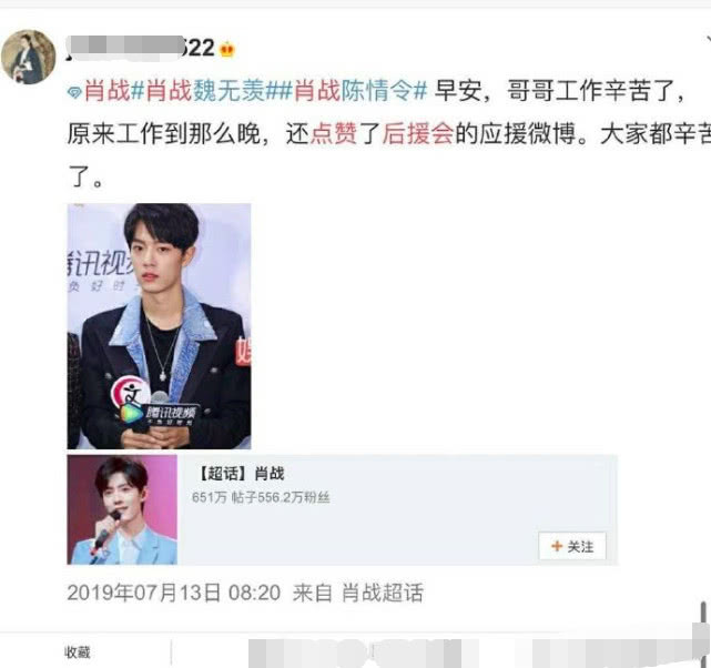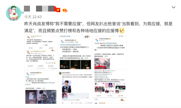 肖战和工作室及时正面的处理问题的态度获得了不少网友的力挺,然而黑粉们却没有因此放过继续黑肖战的机会。5月11日晚,肖战又被扒出昔日言论。早年他曾发布过这样一段话:“有时我在想,满足到底是什么,当我看到,你们为我熬夜爆肝,为我应援,远道而来,我觉得,这就是满足。”并且还连带被扒出他频繁点赞打榜和各种场地应援的应援博。
