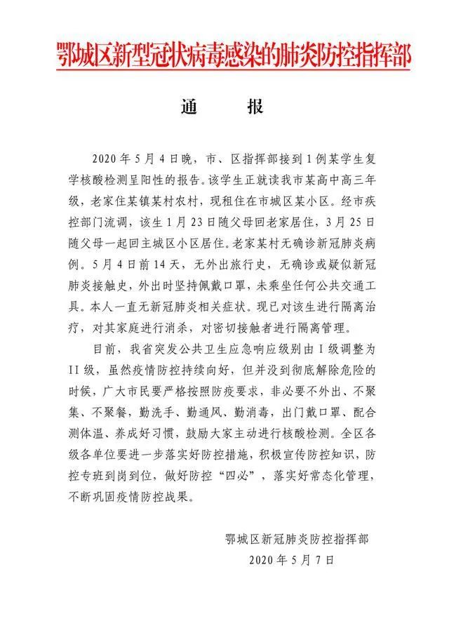 通报称,5月4日晚,市、区指挥部接到1例某学生复学核酸检测呈阳性的报告。该学生正就读鄂州市某高中高三年级,老家住某镇某村农村,现租住在市城区某小区。经市疾控部门流调,该生1月23日随父母回老家居住,3月25日随父母一起回主城区小区居住。老家某村无确诊新冠肺炎病例。5月4日前14天,无外出旅行史,无确诊或疑似新冠肺炎接触史,外出时坚持佩戴口罩,未乘坐任何公共交通工具。本人一直无新冠肺炎相关症状。现已对该生进行隔离治疗,对其家庭进行消杀,对密切接触者进行隔离管理。