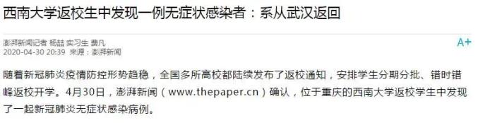 此前,重庆西南大学返校学生中也发现了一起新冠肺炎无症状感染病例。