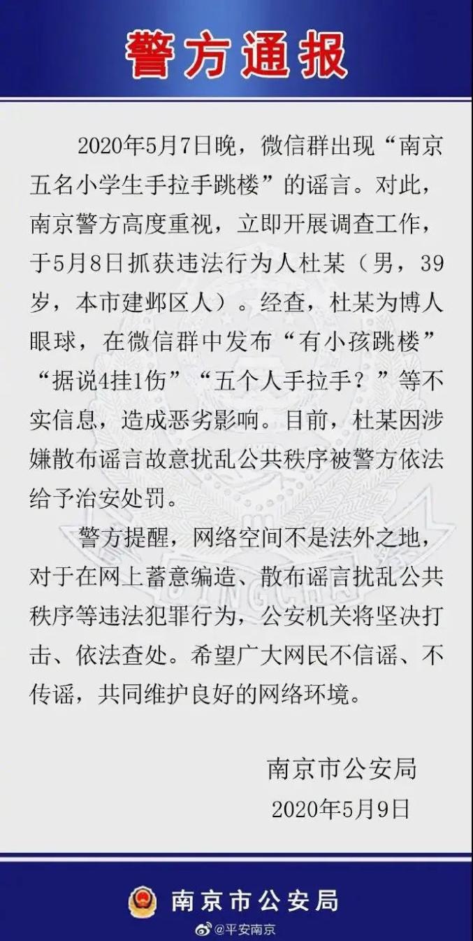 5月9日00:39,江苏省南京市公安局官方微博@平安南京 发布了一则通报:
