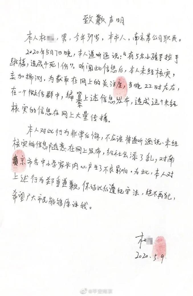 目前,造谣者杜某已被警方给予治安处罚,他的手写致歉信也被公布了。