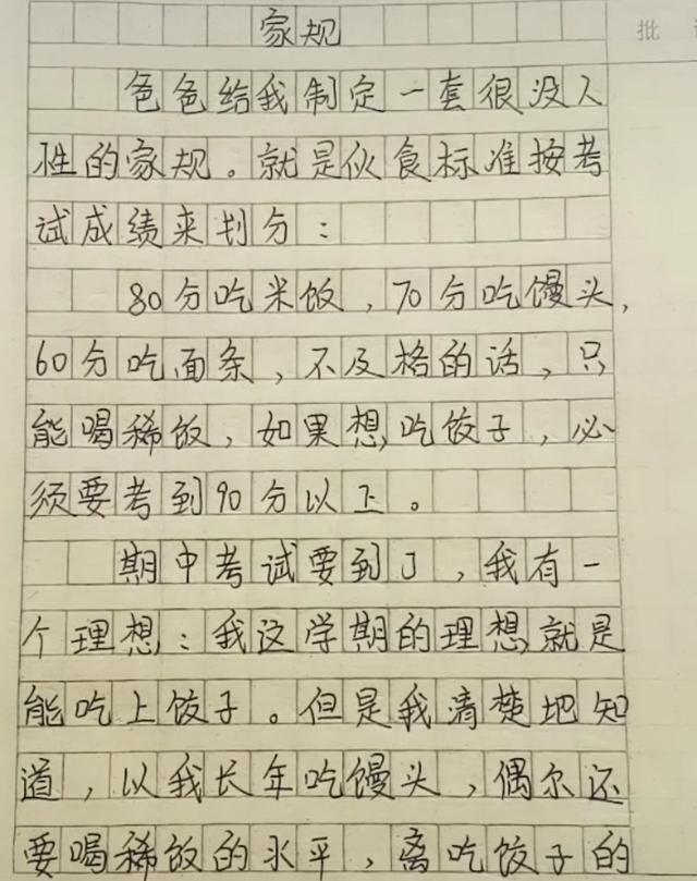 接下来的这位小学生写了一篇题为《家规》的作文,第一段就足够吸引人了,他是这样写的“爸爸给我制定了一套没人性的家规,就是伙食标准按照考试成绩来划分。”