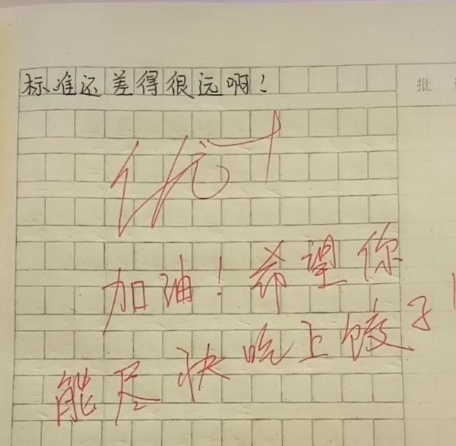 最后一段则更为搞笑,自己很想要在期中考试之后吃上饺子,可是自己却心知肚明的是常年只能吃馒头,而偶尔还要喝稀饭,这样的水平离吃饺子的标准还差得很远。老师评语中则鼓励道“加油!希望你能尽快吃上饺子。”
