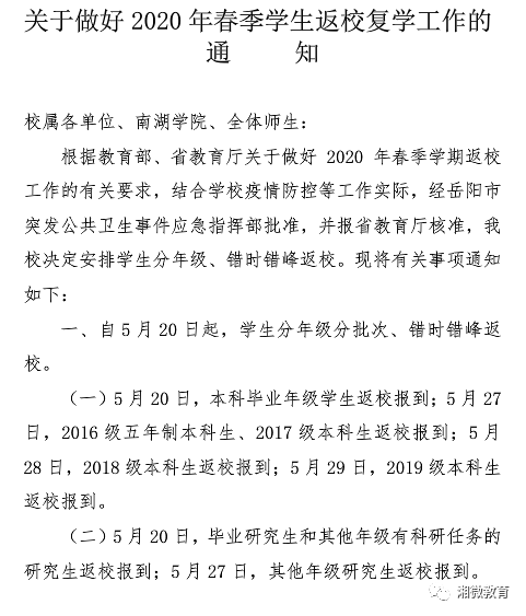 按照教育部、湖南省、长沙市等关于高校春季学期开学有关要求,学校结合实际,制定了2020年春季学期开学整体方案,并报长沙市疫情防控指挥部、湖南省教育厅同意和教育部备案。现将有关事项通知如下:一、5月12日起,全体教职工分批返校上班,返校条件及具体安排按照人事处通知要求执行。二、5月16日-17日,必须到校才能完成毕业论文(设计)或临床实习任务的2020届毕业生、目前必须承担住培任务的医学生返校报到。返校条件和具体要求由各二级学院通知每位学生,其他学生分批返校时间另行通知。未接到返校通知的学生一律不得返校。三、目前需在校学习的继续教育学生开学时间由继续教育学院另行通知,现在国(境)外(含港澳台地区)的师生员工不返校。