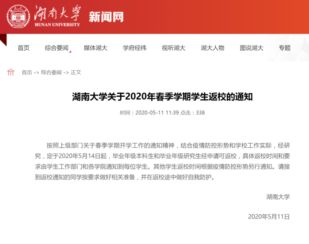 湖南大学关于2020年春季学期学生返校的通知