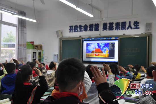 图为浙江理工大学研支团成员组织学生在教室参加升旗仪式。浙江理工大学研支团 供图