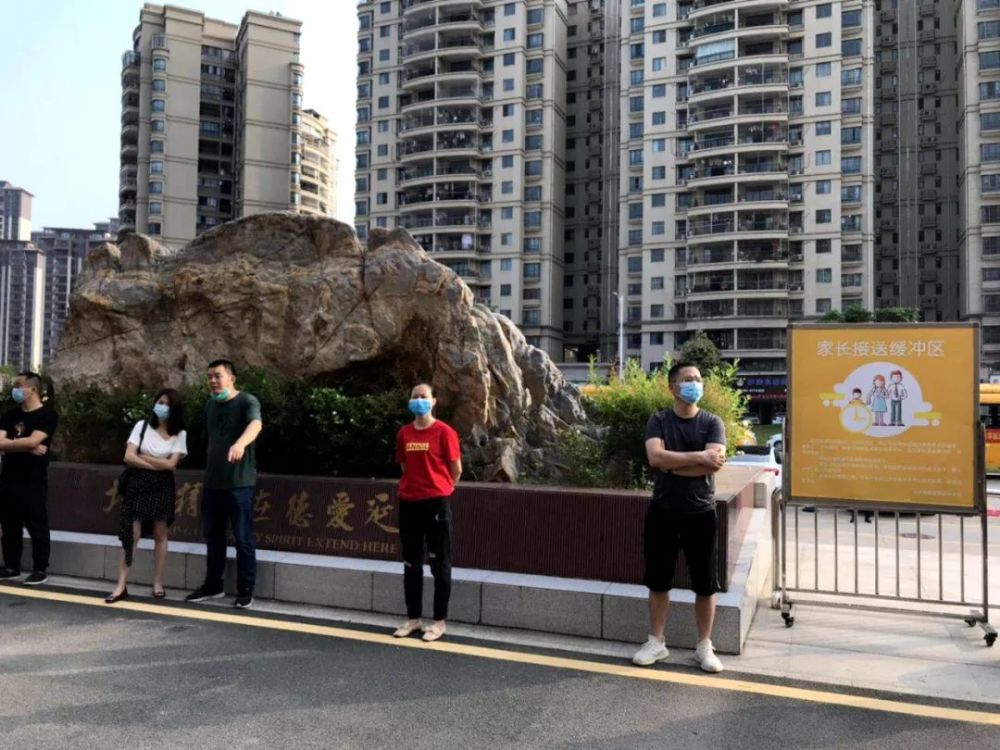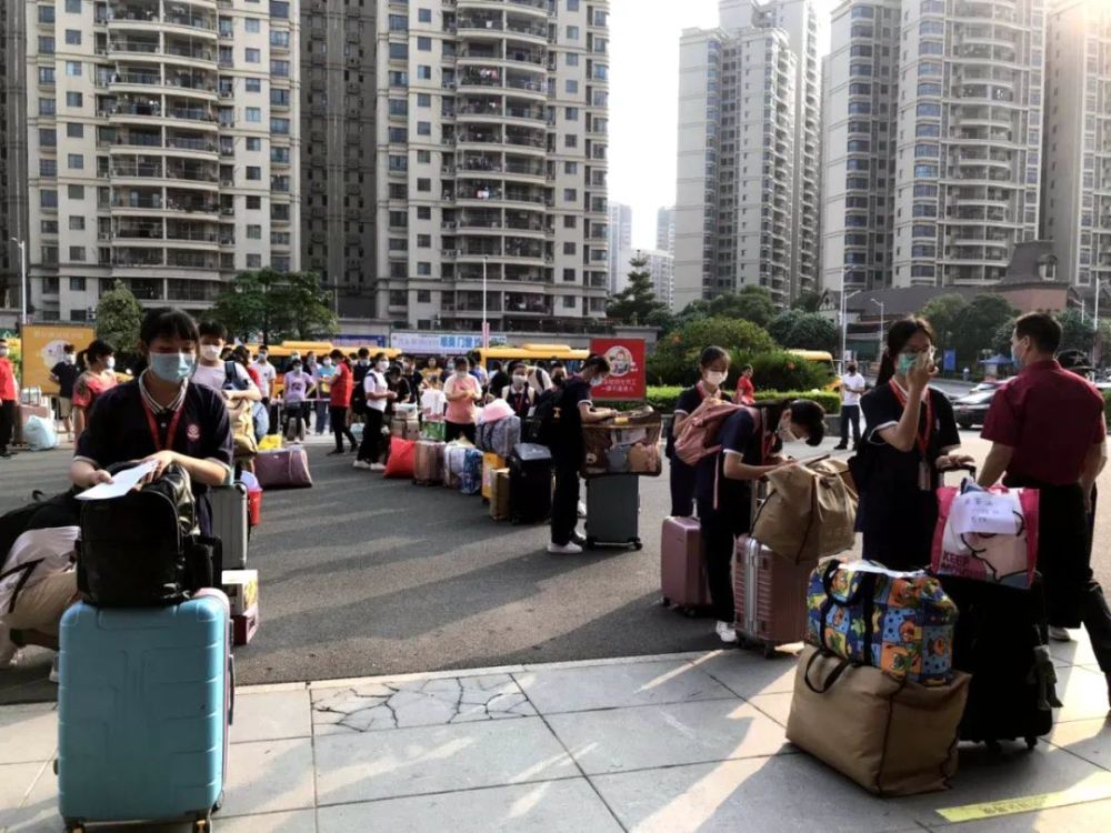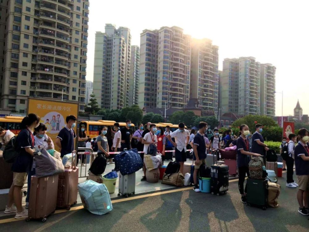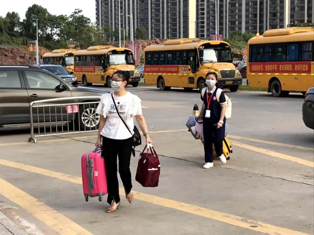 家长们在接送缓冲区,目送孩子们回校。家长把孩子的行李搬下车,便交给老师带孩子进校,心情是复杂的,既高兴又不舍,一直看着孩子回校的背影直到看到孩子放心入校才肯离开。