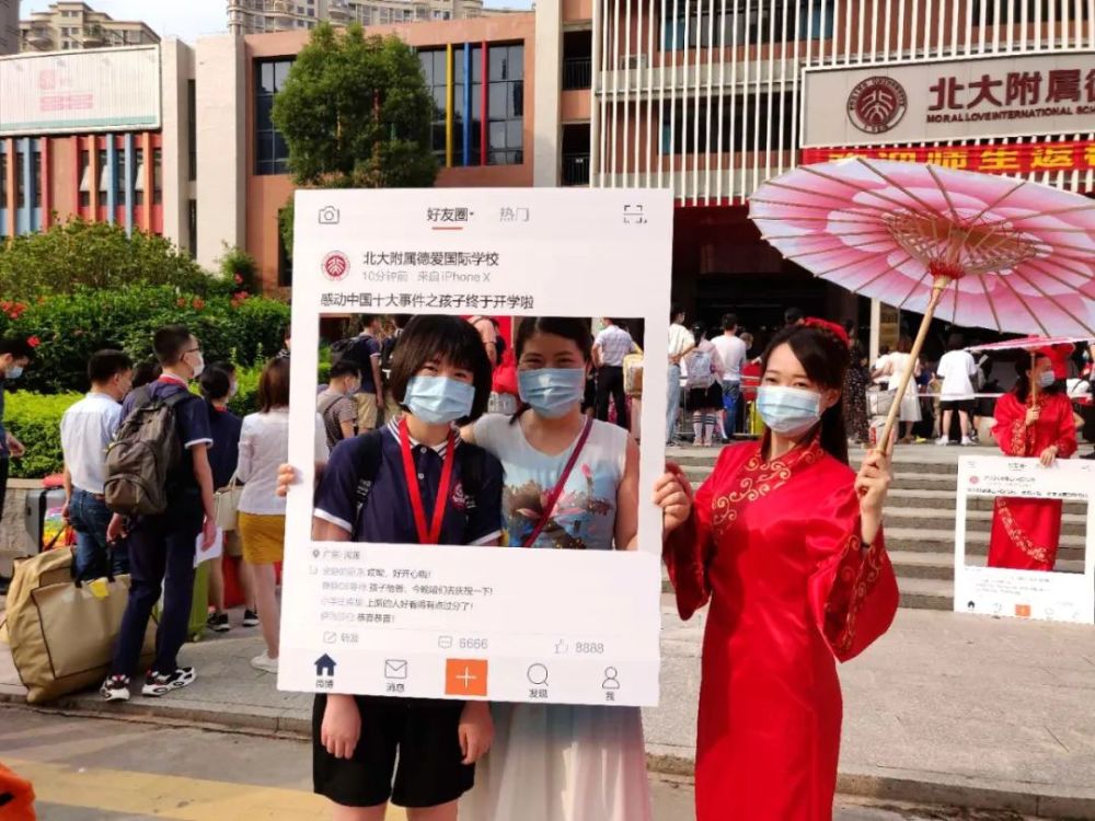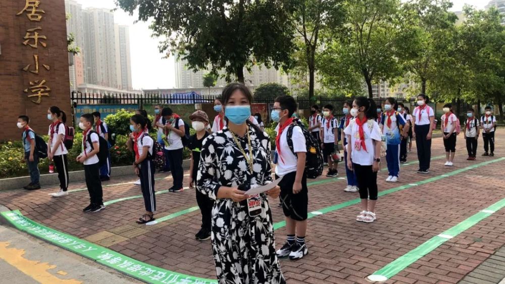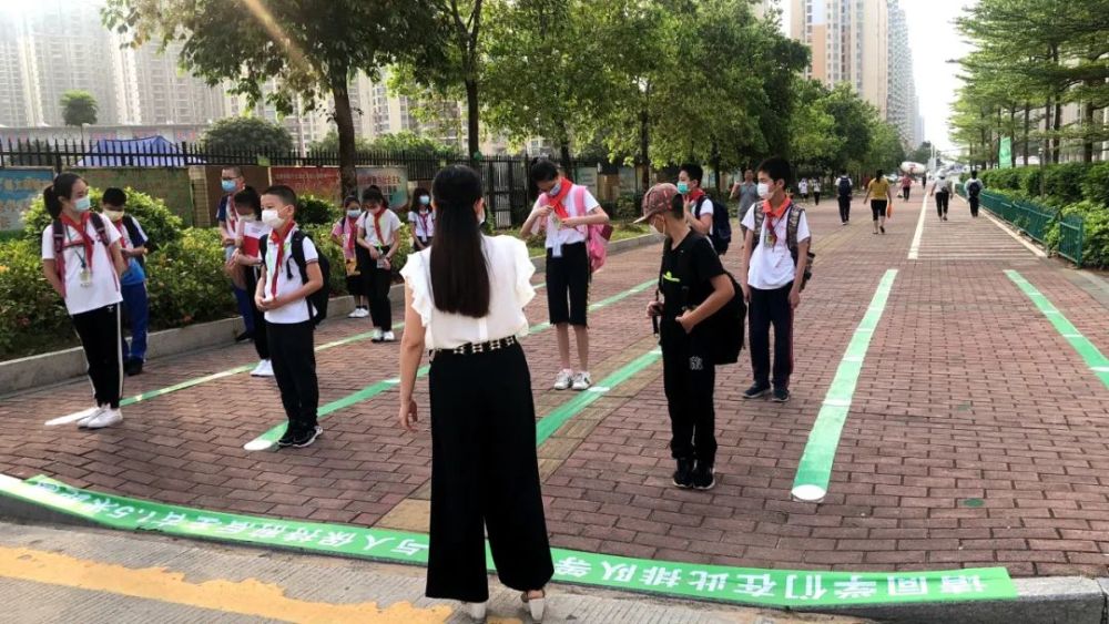 在老师的指引下,同学们戴好口罩,分批次站在两侧10条通道相隔1.5米的原点上,等待进入学校。
