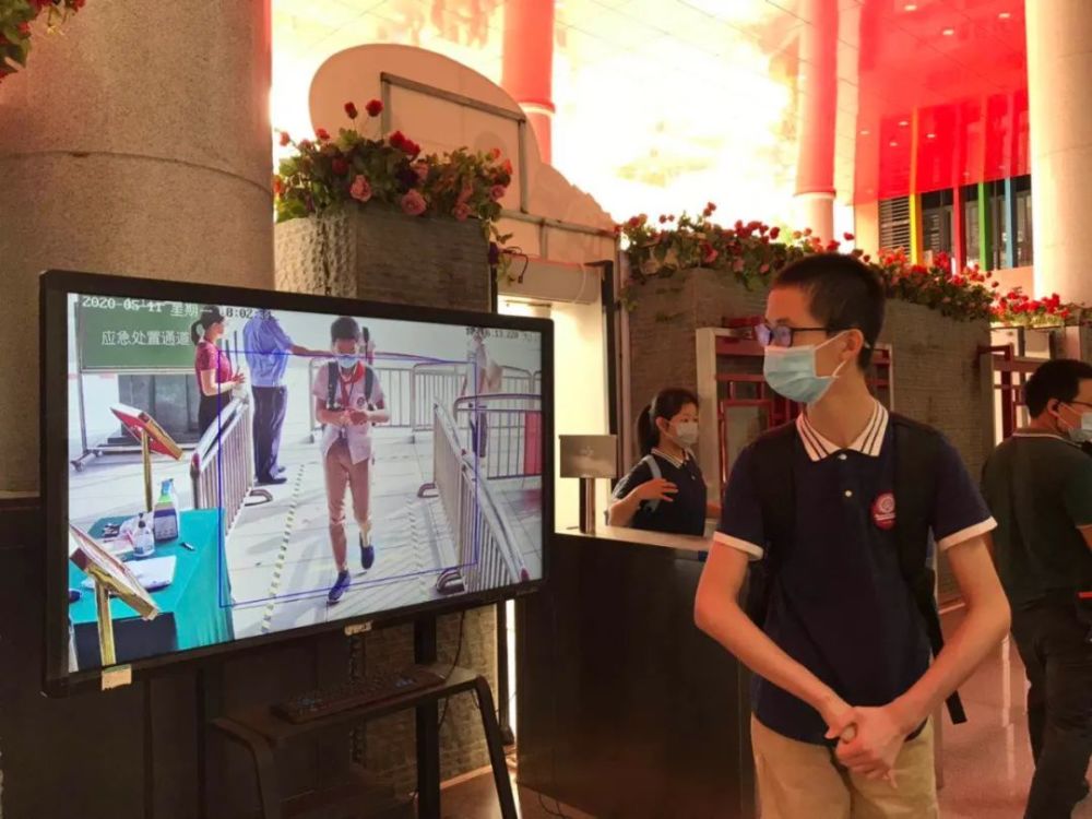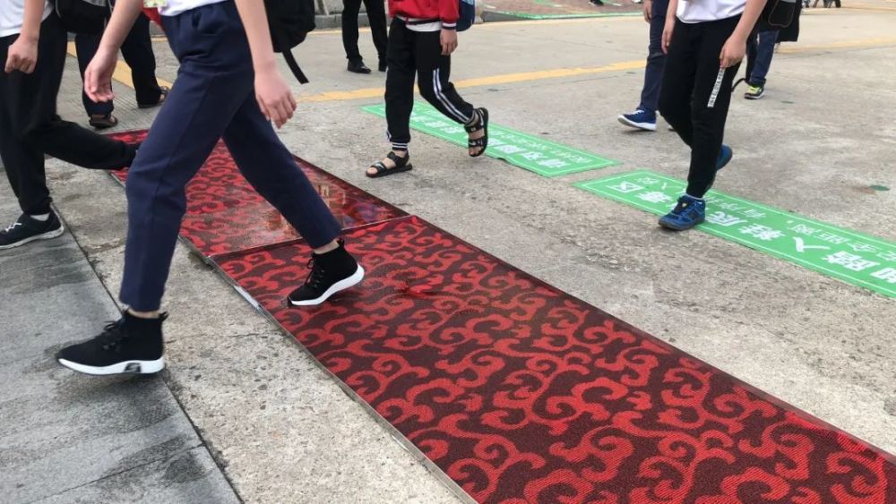 踩消毒踏板走进校门后,第一批同学按指定的四条通道陆续进入学校迎接下一步检测。