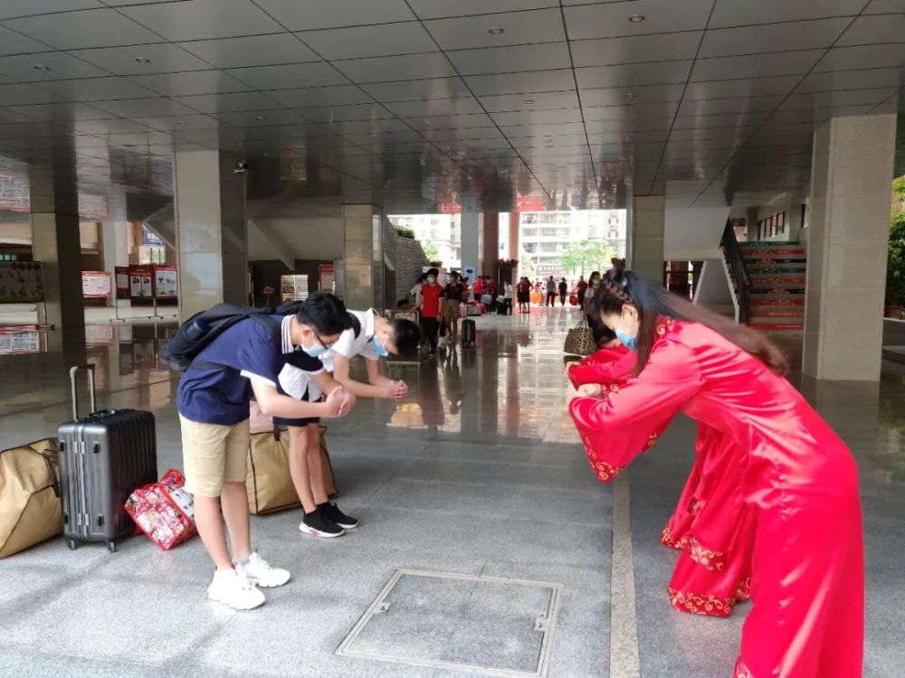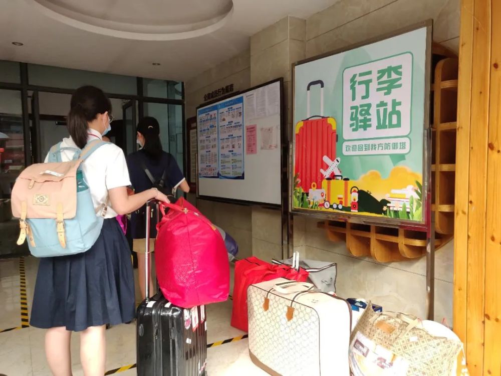 学生行李由老师统一摆放好,一起拿到宿舍的行李驿站。