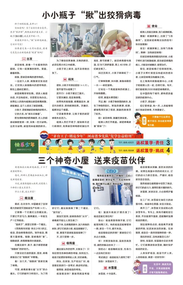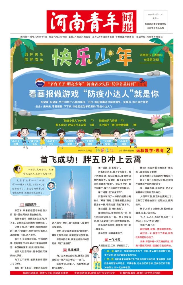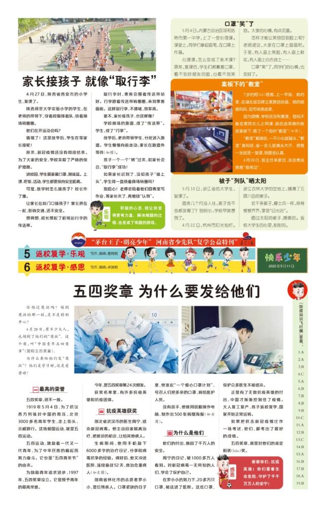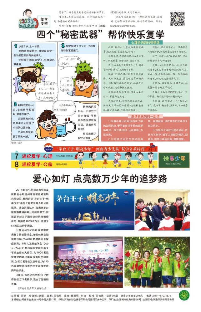 这是河南青年时报社《河南青年时报・快乐少年》精心编辑出版的20万份河南省少先队队报。复学首日,这期由河南青少年发展基金会发起的“茅台王子・明亮少年 河南省少先队复学公益特刊”,正在紧急“赶”往全省600多所学校。