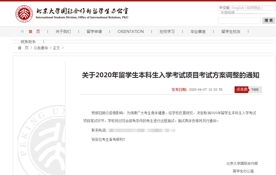 北京大学在官方网站发布了《关于2020年留学生本科入学考试方案调整的通知》,根据通知,由于今年疫情影响,决定取消2020年留学生本科生入学笔记,改为远程面试录取。