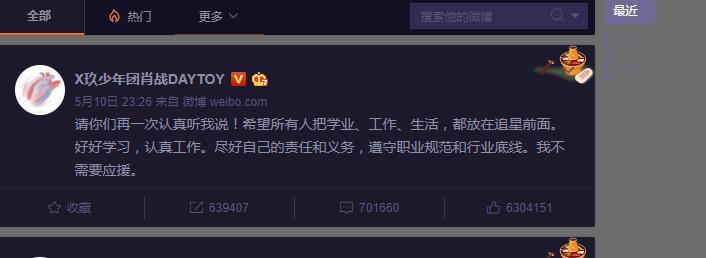 5月10日晚,肖战本人在社交平台发文回应了关于粉丝应援一事,他态度诚恳地喊话粉丝: “请你们再一次认真听我说!希望所有人把学业、工作、生活都放在追星前面。好好学习,认真工作。尽好自己的责任和义务,遵守职业规范和行业底线。我不需要应援。”