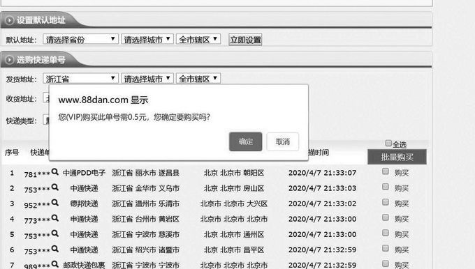 记者登录了一个单号网,该网站拥有海量快递单号,地域范围涵盖全国,涉及几乎所有的快递公司,而且每天都在更新。花费0.5元,就能购买一条快递单号。记者尝试了几次,并使用快递公司官网查证,发现这些单号全部真实。通过单号,可以了解快递的发货地、收货地、实时状态。但不显示收货人手机号,显示收货人姓名也很少。