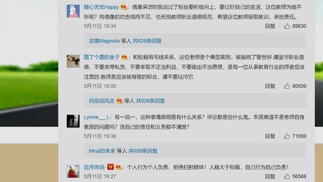 一位网名叫涸泽HZ的网友评价:所以希望广大教师记住,你追星可以,但是要是夹带私货引导自己学生追你喜欢的明星,甚至不保护他们的隐私发到公众平台上进行炫耀,那么真不配当老师。